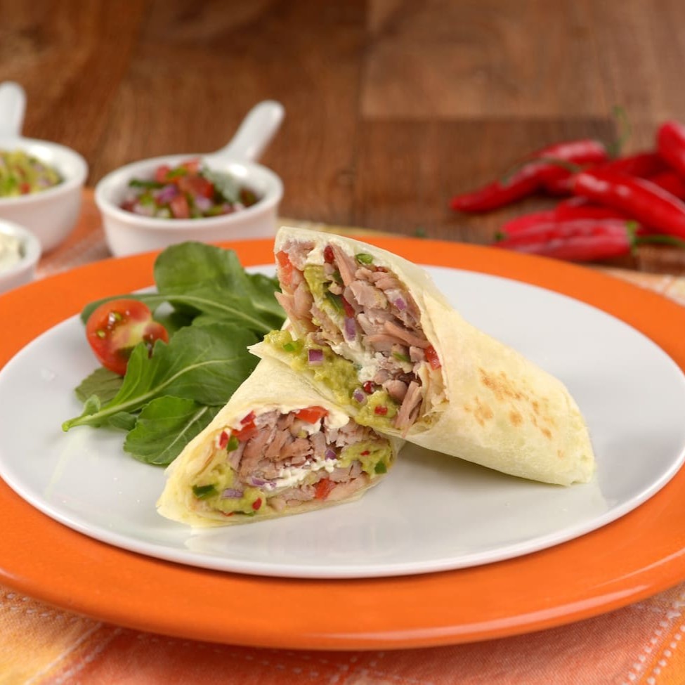 Tortilla de trigo fininha e levemente tostada, enrolada e recheada com delícias típicas Mexicanas. Montado com pernil desfiado, queijo prato, salsa Mexicana, guacamole e sour cream.