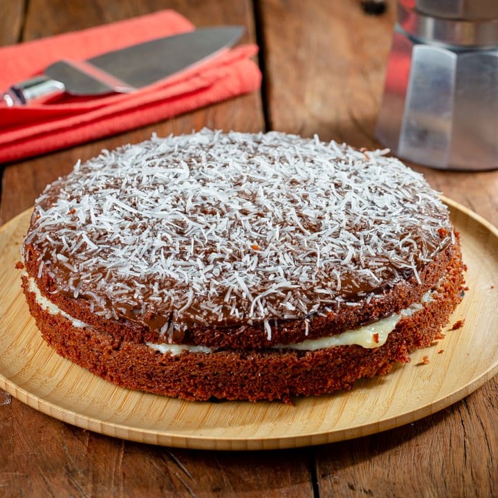 A mistura do coco que leva chocolate branco e uma massa amanteigada, enchem os olhos e a boca de tanta vontade de dar aquela primeira mordida, um ganache por cima de chocolate meio amargo dando aquele equilíbrio de sabor. Das maravilhosas receitas da rosa, este bolo ganha uma página especial, é tão gostoso quanto colo de mãe, um convite especial ao que faz bem ao coração. 600 grs
