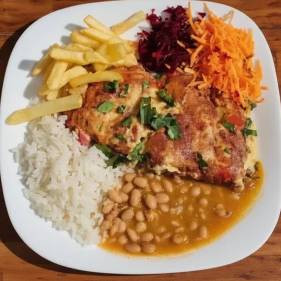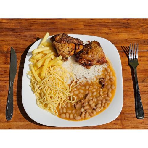 Acompanha: arroz, feijão, legumes, fritas, omelete (ovo, queijo e cheiro verde) e salada (embalagem separada).Quem ama uma refeição vegetariana também tem seu lugar garantido aqui!.