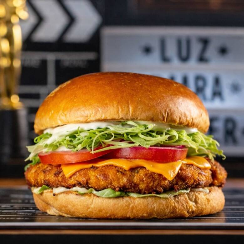 Pão Brioche, Hamburger de Frango, cheddar, alface, tomate, cebola roxa e Maionese verde.