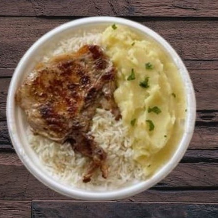 Marmita com deliciosa bisteca suína preparada com arroz branco feijão e purê de batata inglesa. Marmita indicada para 01pessoa.