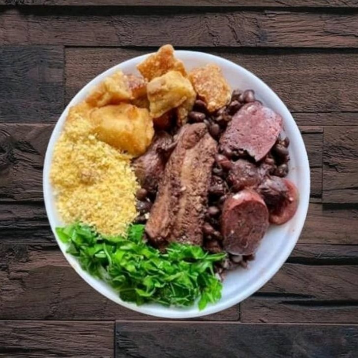 Feijoada magra: carne seca, lombinho fresco, costelinha suína,. Acompanhado de arroz branco couve refogada na manteiga torresmo vinagrete e a deliciosa farofa do chef. Pote de 500ml de feijoada exclusiva ideal para uma pessoa..