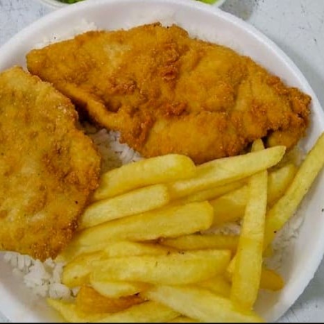 Filé de frango à parmegiana acompanha arroz branco e batata frita .... Serve uma pessoa Aprox..500g