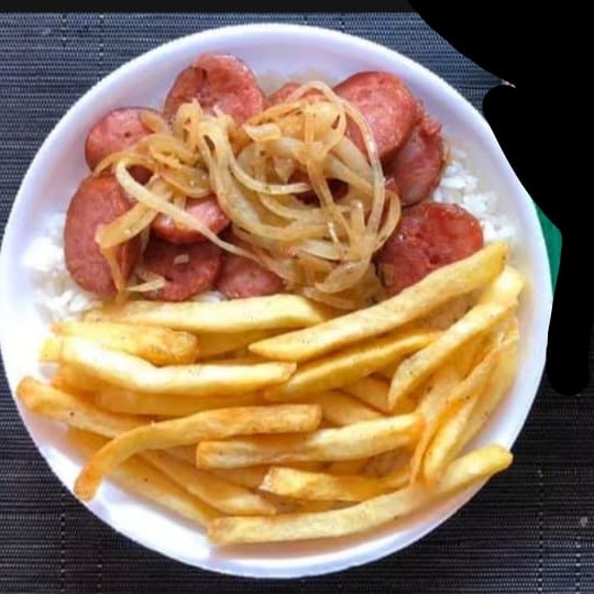 Calabresa defumada acebolada Aurora com arroz branquinho e fritas serve uma pessoa Aprox ....500g