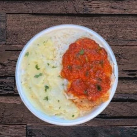 Marmita com delicioso filé de frango parmegiana (empanado na massa crocante coberto com molho de tomate e queijo). Acompanhado de arroz branco e purê de batata inglesa. Marmita indicada para 1 pessoa.