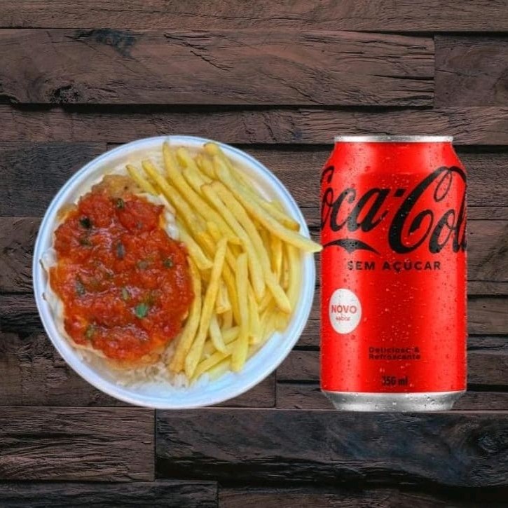 Marmita com um deliciosa filé de frango parmegiana (empanado na massa crocante coberto com molho de tomate e queijo) acompanhado de arroz branco e batata frita ,+ coca cola zero lata 350 ml de....Marmita indicada para 01 pessoa.