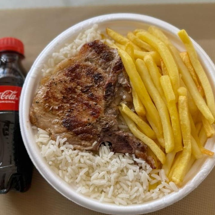 Marmita com deliciosa bisteca suína preparada com arroz branco, feijão e batatas fritas. Acompanha refrigerante pet Coca Cola bem gelado. Marmita indicada para 01 pessoa.