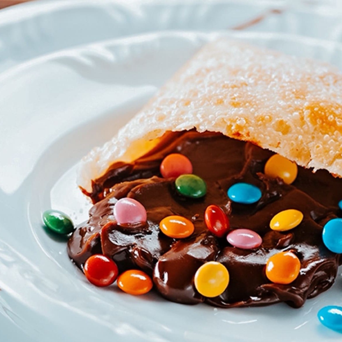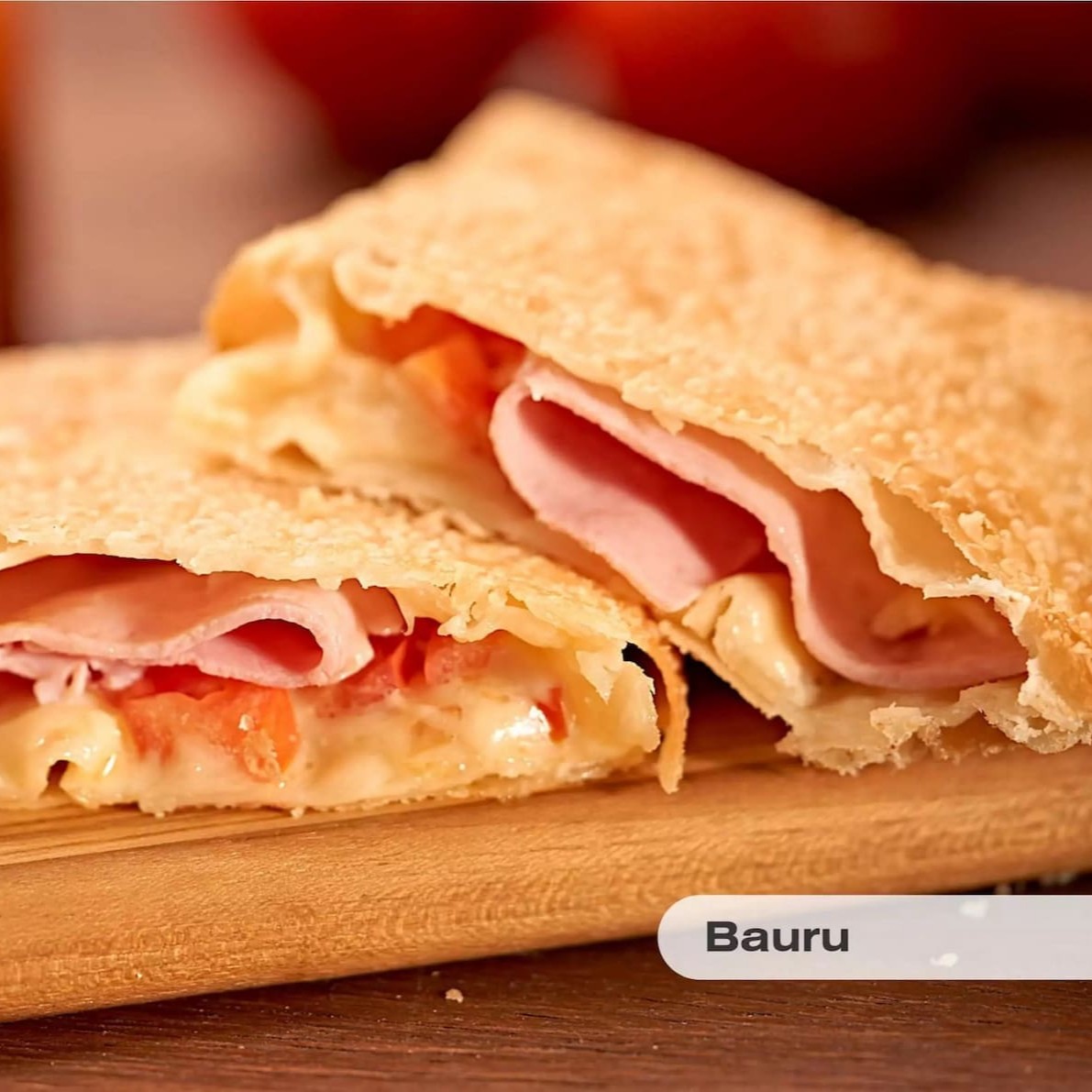 delioso pastel de bauru com presunto e queijo e uma fatia de tomate