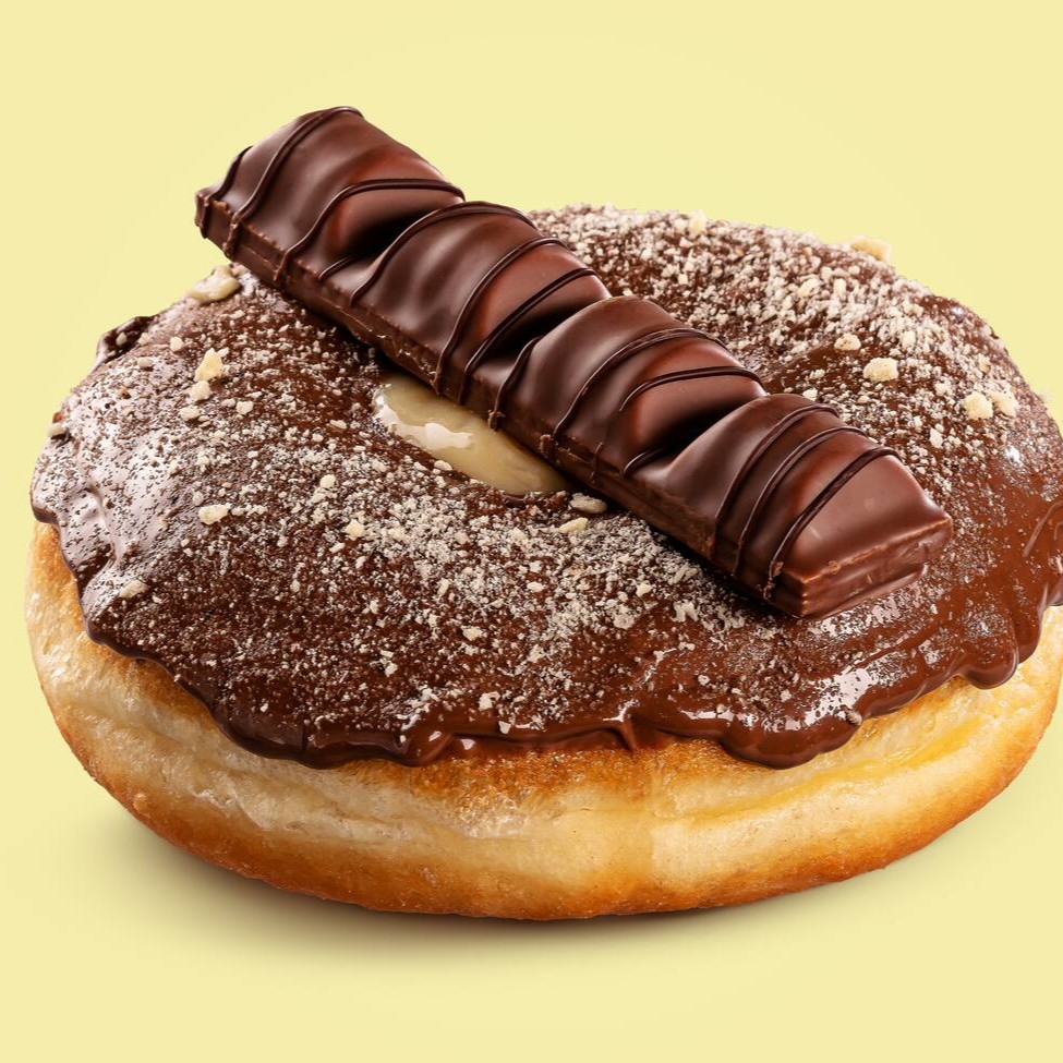 Donuts Recheado de Creme de ovomaltine OFICIAL, coberto de riscos de chocolate ao leite e crocantes de ovomaltine.