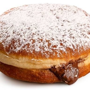 Donuts recheado de doce de leite e coberto com açúcar de confeiteiro.
