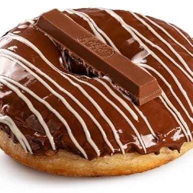 Donuts coberto de chocolate ao leite, fios de chocolate branco e um Kitkat preto.