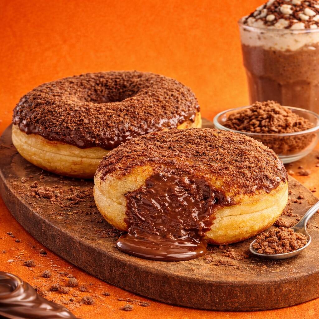 Donuts coberto de chocolate ao leite e Ovomaltine.