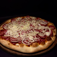 Massa crocante, molho de tomate, orégano, azeitonas, Calabresa aurora e Cebola