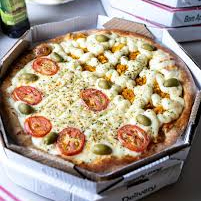 Massa crocante, molho de tomate, orégano, azeitonas, mussarela e tomate