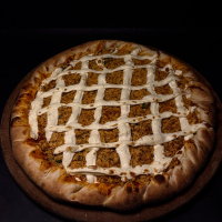 Massa fininha, molho de tomate, orégano, azeitona, frango temperado e catupiry