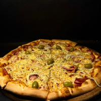 Molho de tomate, massa fininha, orégano, azeitonas, calabresa aurora moída e mussarela