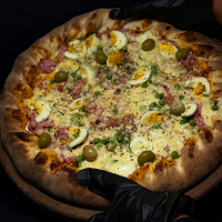 Molho de tomate, massa fininha, orégano, azeitonas, presunto, mussarela, ervilha e ovos