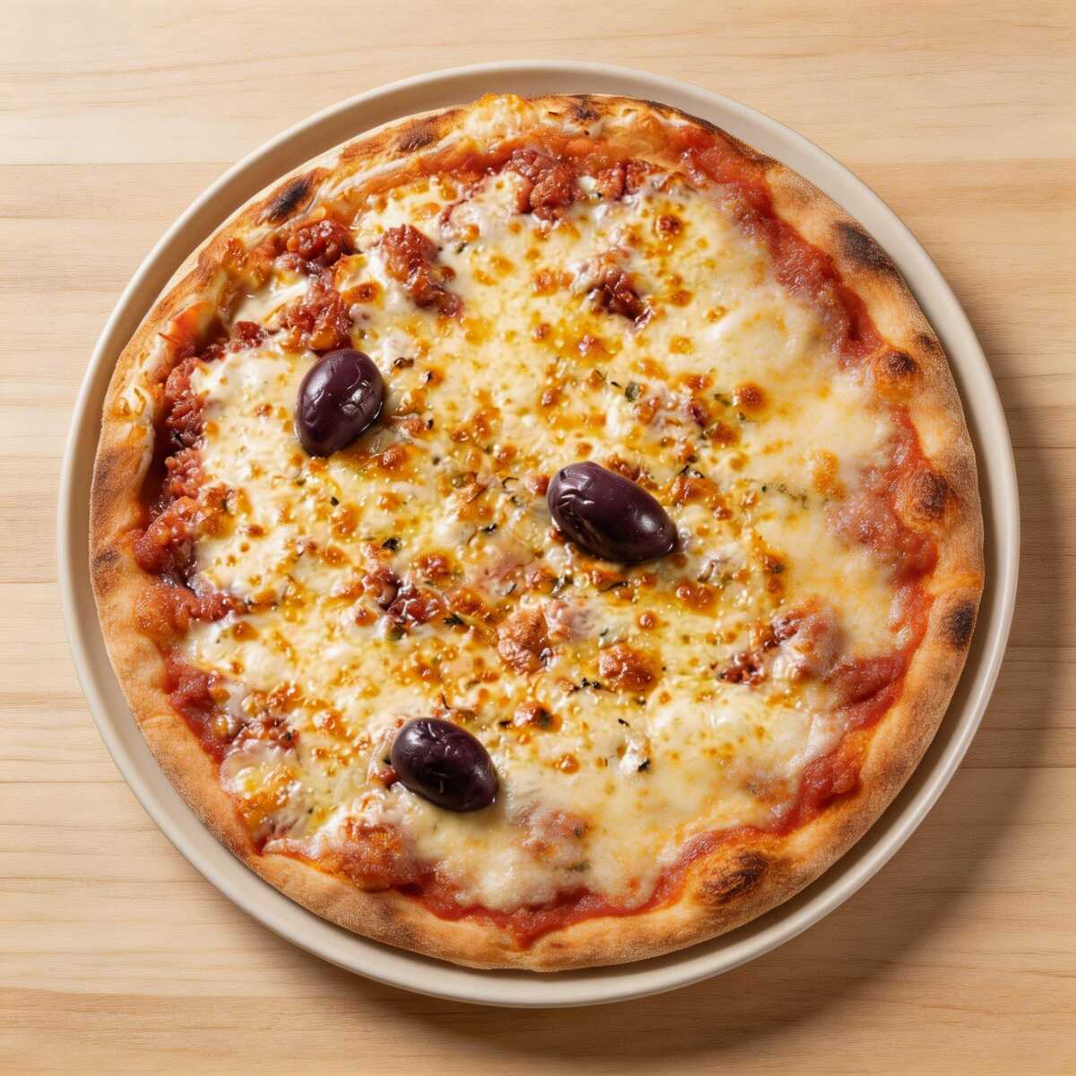 Molho de tomate, massa fininha, orégano, azeitonas, mussarela e rodelas de tomate