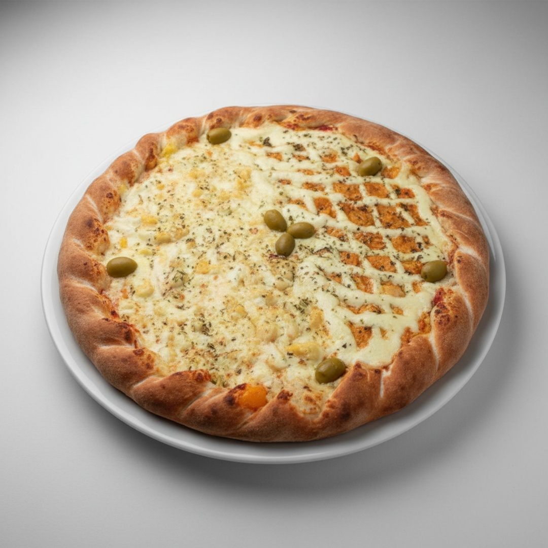 Massa fininha, molho de tomate, orégano, azeitonas, frango temperado e catupiry