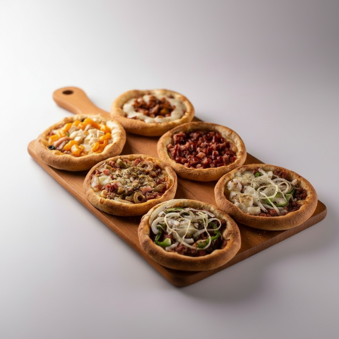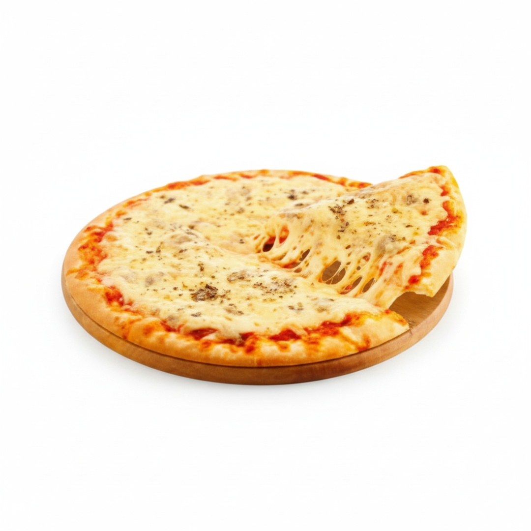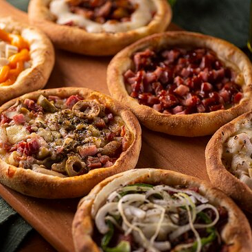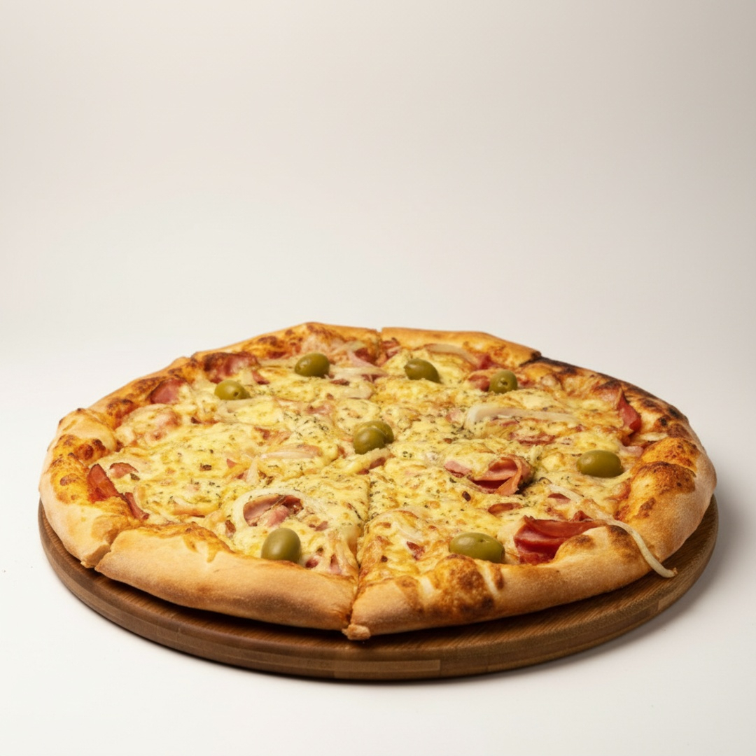 Molho de tomate, massa fininha, orégano, azeitonas, mussarela, provolone, parmesão e catupiry