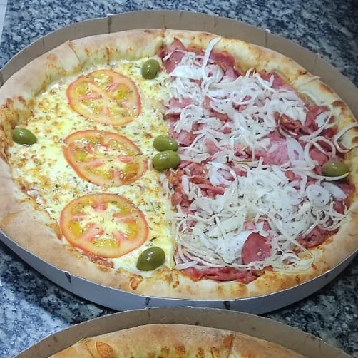 Pizza meio a meio calabresa c/ cebola e meia mussarela c/ rodelas de tomate , finalizando com azeitonas e oregano