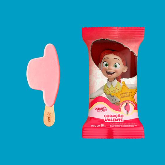 Inspirado no chapéu da Jessie, esse picolé tem formato exclusivo e sabor que conquista: morango com leite. Feito à base de fruta, é fonte de fibras, ideal para quem tem coragem de provar novos sabores! Alérgicos: contém derivados de leite. Pode conter cevada, trigo, centeio, aveia, ovos, amendoim, soja, amêndoa, avelãs, castanha-de-caju, castanha-do-pará, macadâmias, nozes e pistaches.