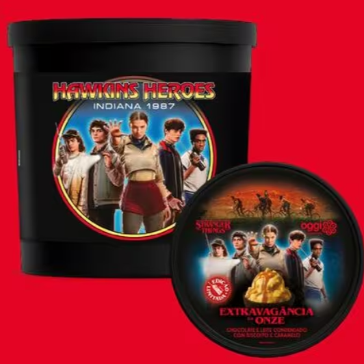 Esse sorvete é pura indulgência no pote: mescla de leite condensado, chocolate, pedaços de biscoito e caramelo. Cremoso, intenso e irresistível tão poderoso quanto a própria Onze! E o melhor de tudo que você ainda pode colecionar os potes e utiliza-los como balde de pipoca para curtir enquanto maratona a série. Alérgicos: Contém glúten, derivados de milho transgênico, leite e soja. Pode conter trigo, aveia, ovos, amendoim e castan
