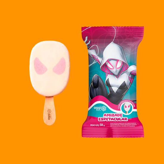 No formato da máscara da heroína Gwen Stacy, esse picolé é feito à base de fruta com sabor de iogurte e frutas vermelhas. Fonte de fibras, traz leveza, doçura e um toque de aventura em cada mordida! Alérgicos: contém derivados de leite. Pode conter cevada, trigo, centeio, aveia, ovos, amendoim, soja, amêndoa, avelãs, castanha-de-caju, castanha-do-pará, macadâmias, nozes e pistaches.