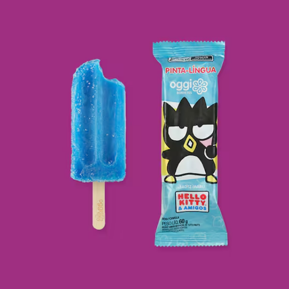 Picolé divertido que pinta a língua, sabor tutti frutti. Alérgicos: Contém glúten e pode conter derivados de leite e castanhas.