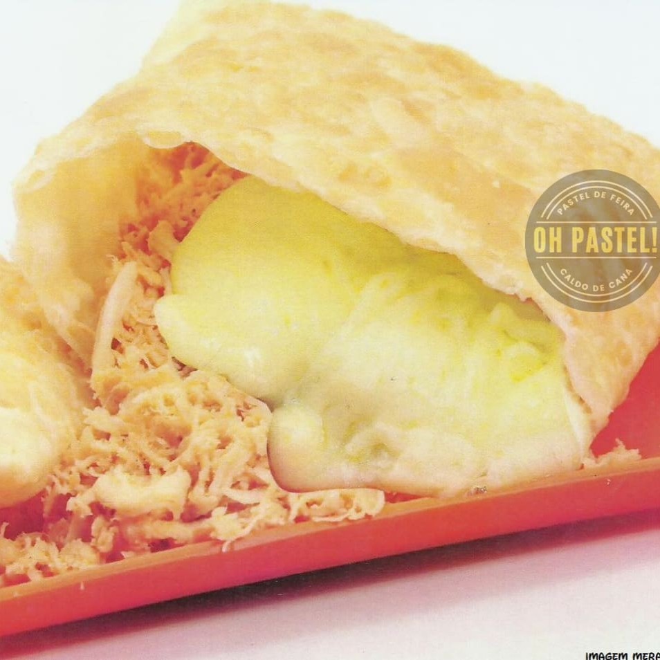 Pastel quentinho e frito na hora, frango desfiado bem saboroso e queijo mussarela. Irresistivelmente saboroso.