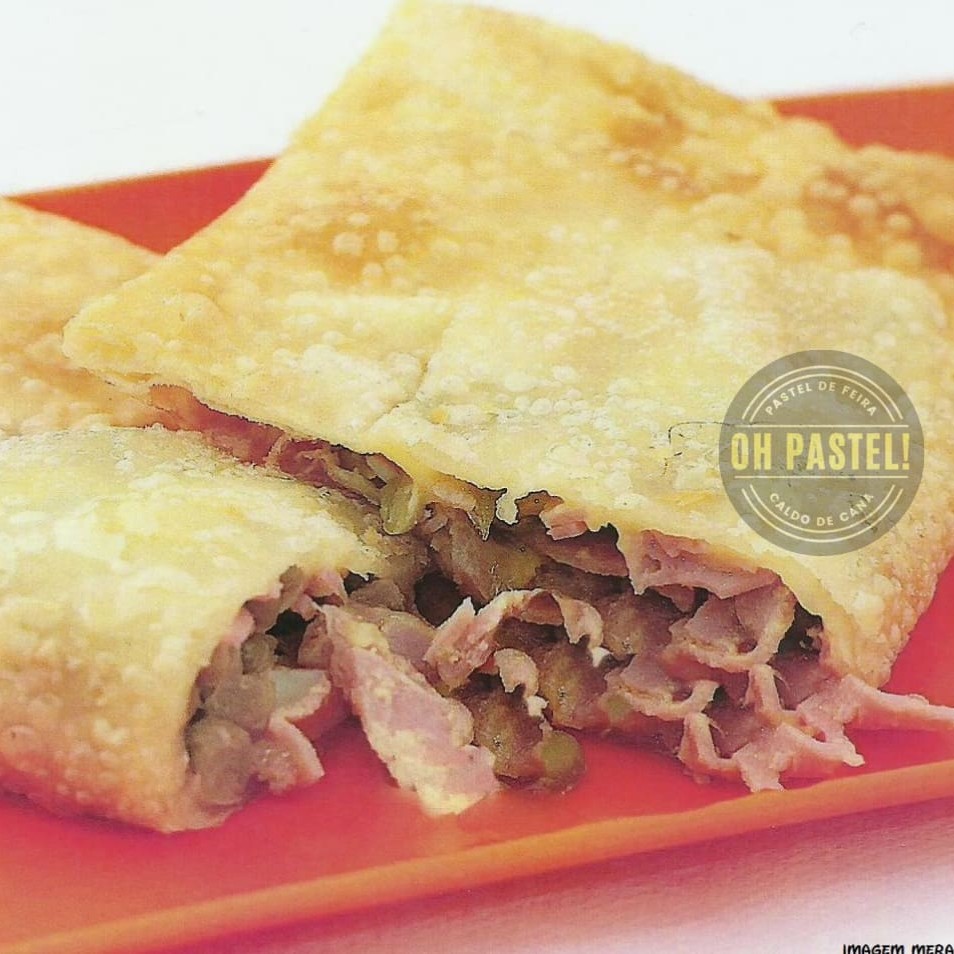 Pastel quentinho e frito na hora, recheio generoso com queijo, presunto, ovo, ervilha e azeitona. Delícia sem igual.