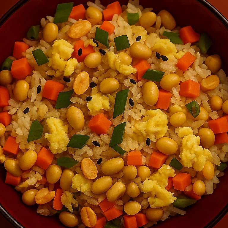Arroz frito no estilo japonês, preparado com tofu defumado e linguiça vegana artesanal, ervilha, milho, pimentão, cenoura, cebola e repolho, finalizado com amendoins crocantes, óleo de gergelim e o tempero especial da okaasan. Uma versão 100% vegana, leve, colorida e cheia de sabor.