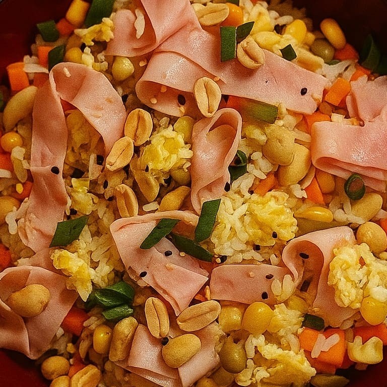 Nosso delicioso arroz frito no estilo japonês! Preparado com ovos, ervilha, milho, pimentão, cenoura e presunto, finalizado com crocantes amendoins. Um prato colorido, saboroso e cheio do carinho da okaasan