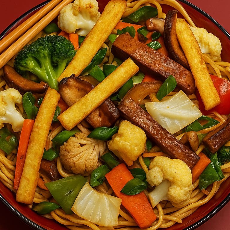 Macarrão de arroz bifum salteado com tiras de tofu frito e tofu defumado, combinado a legumes frescos (repolho, cenoura, cebola e pimentão). Finalizado com gengibre e tempero especial da okaasan. Uma opção vegana leve, saborosa e cheia de personalidade.