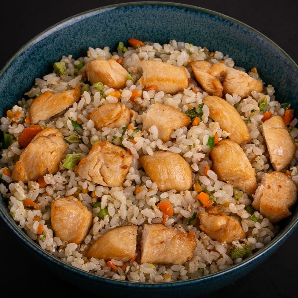 Arroz com ovos,cenoura,cebolinha verde e frango.