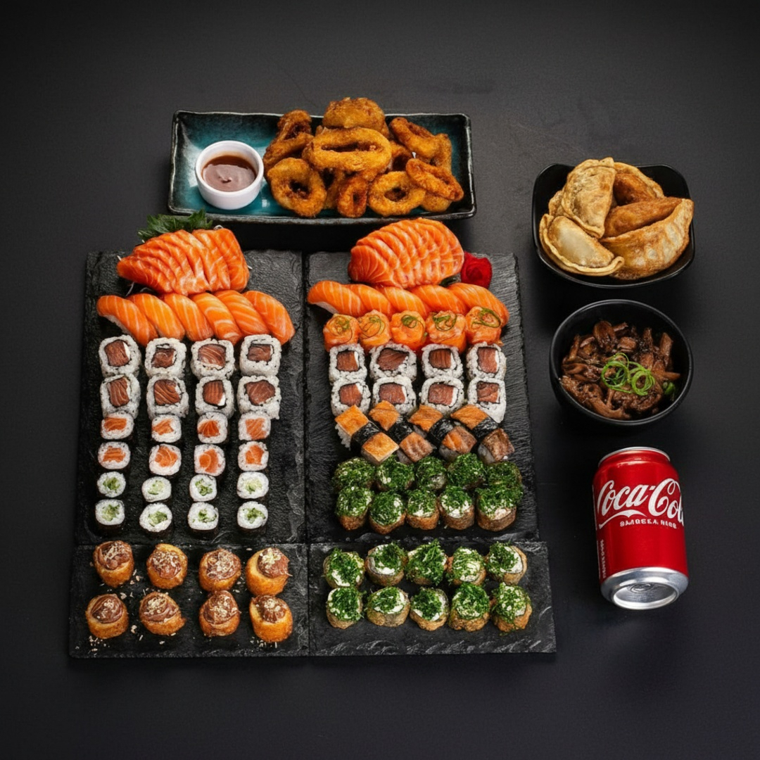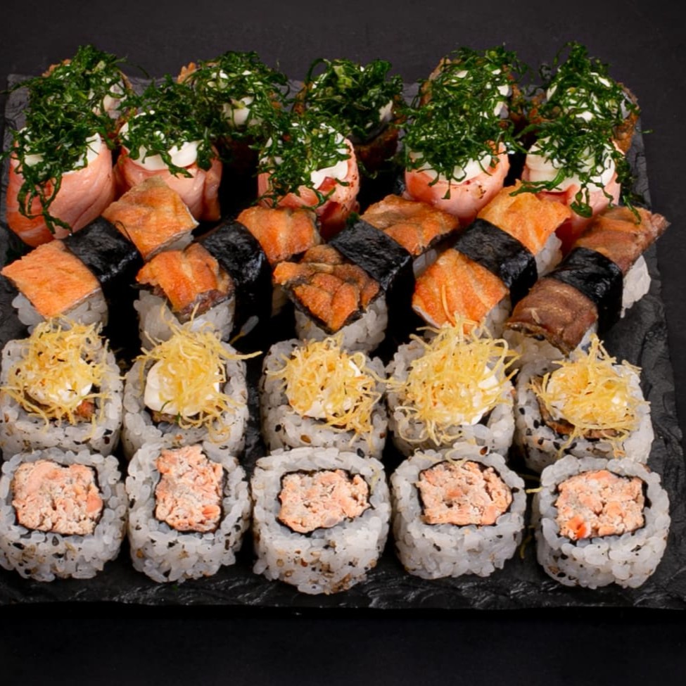 28 sashimis de salmão, 12 niguiris de salmão, 8 hot holls e 20 enrolados. Grátis 8 uni de banana empanada com creme de avelã