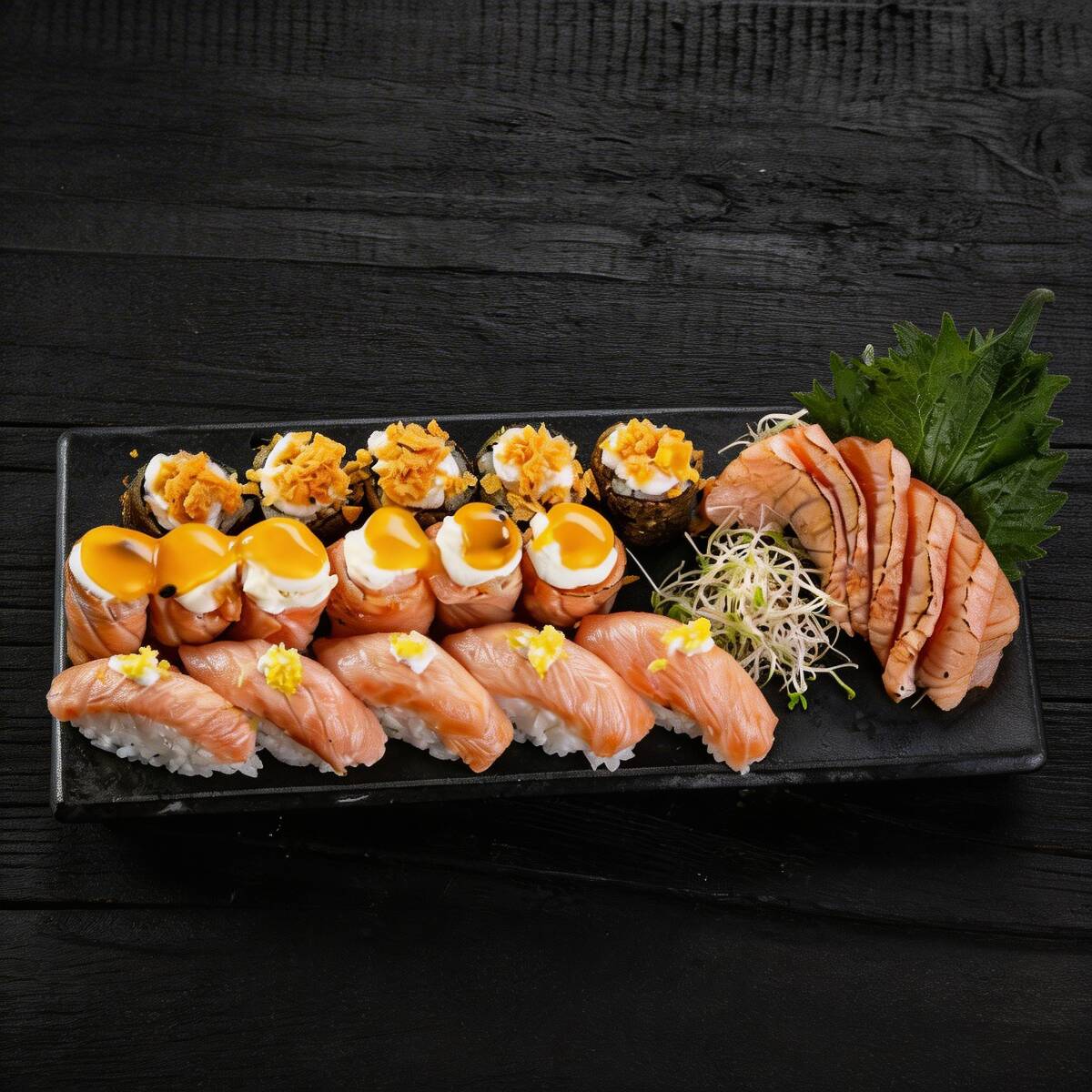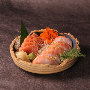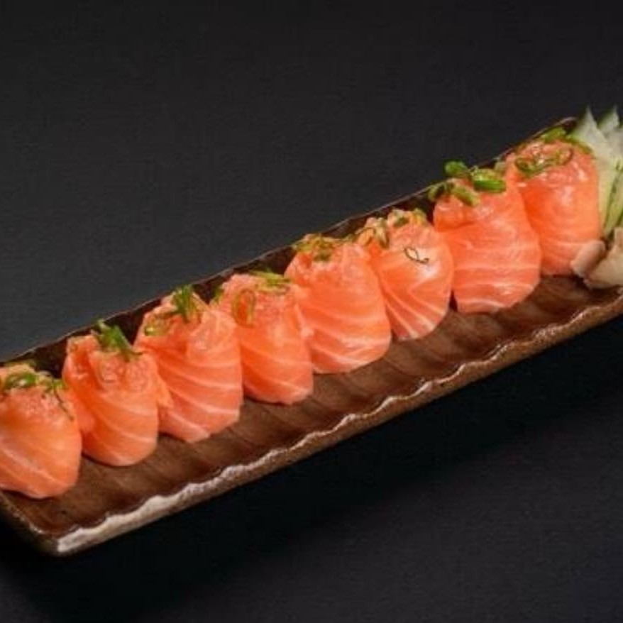 5 sashimi de salmão ,5 niguiri de salmão com azeite trufado e flor de sal