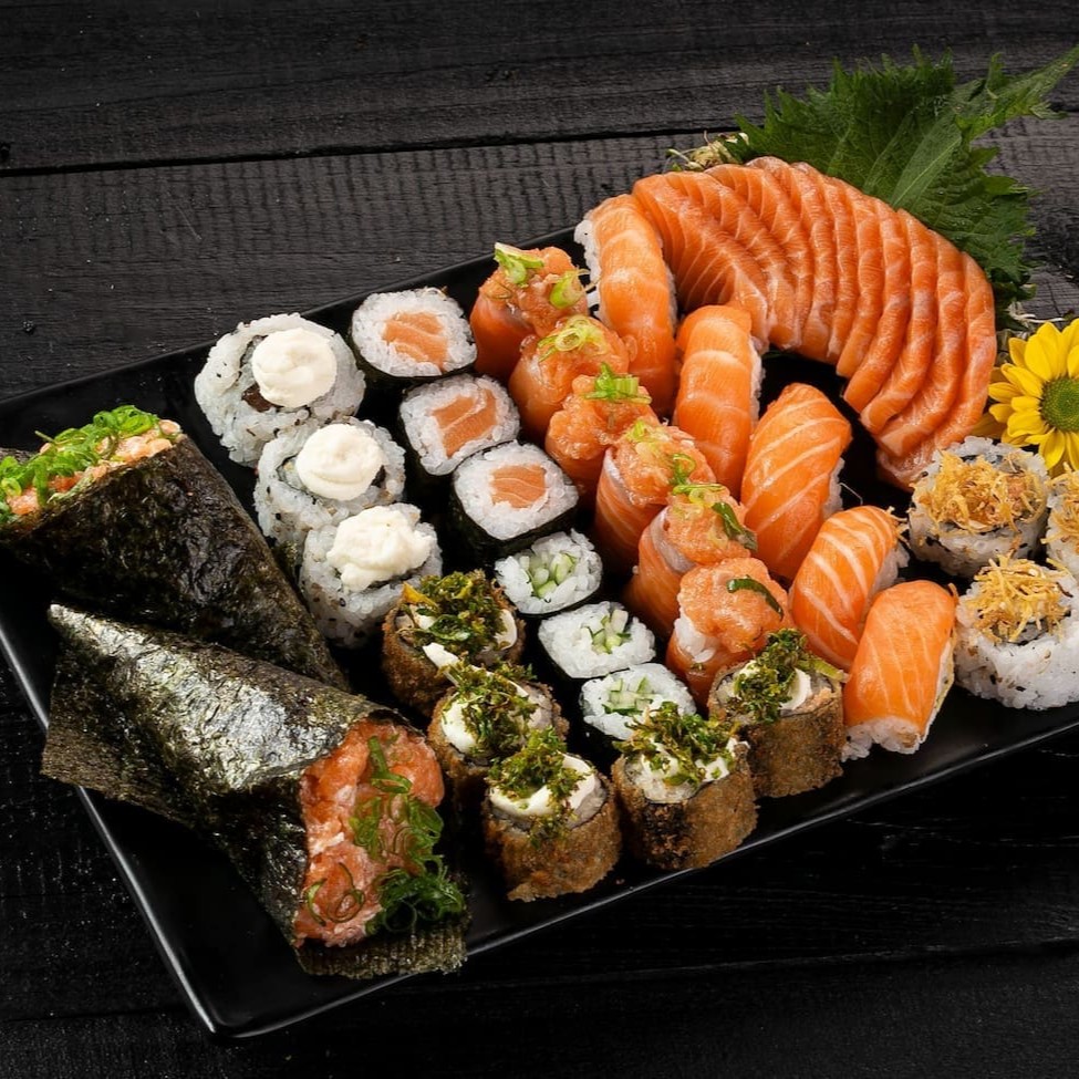 1 temaki de salmão batido !!! 8 sashimis 12 sushis variados igual da imagem 1 salmão grelhado 1 mini porção de shimeji 2 guiozas 4 harumaki de queijo