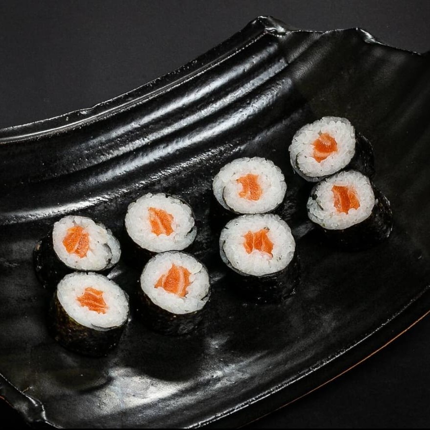 Enrolado em uma folha de alga marinha, recheada com arroz e salmão. (sem alteração)