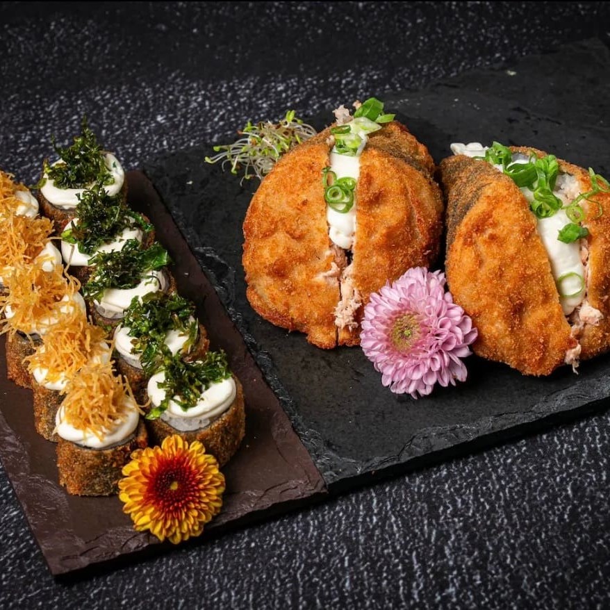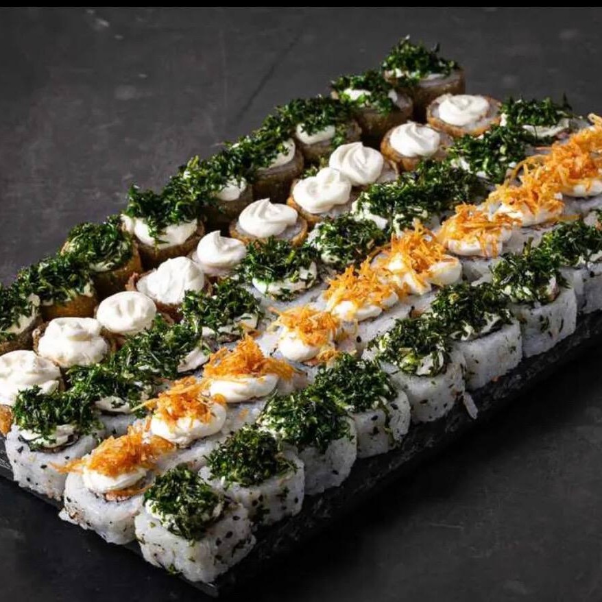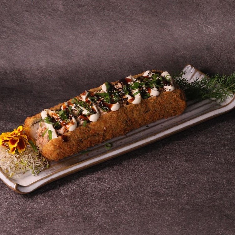 Coberto por uma massa crocante, recheado de salmão e arroz, finalizado com couve crispy e cream cheese. (sem alteração)