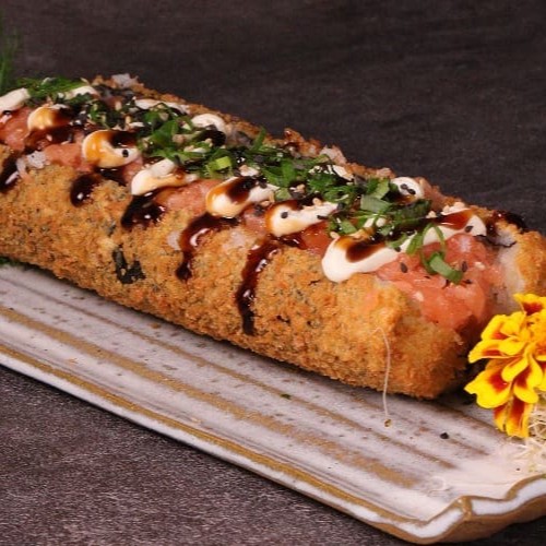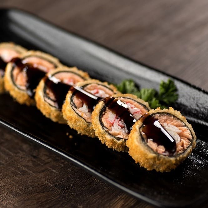 Salmão grelhado com kani, enrolado com salmão por completo, empanado e frito. (sem arroz) (sem alteração)