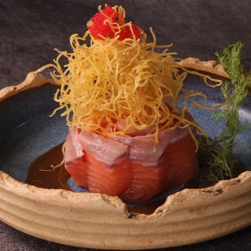 Fatias de salmão especial, finalizada com molho de missô e batata crispy; (Sem Alteração) (sem alteração)