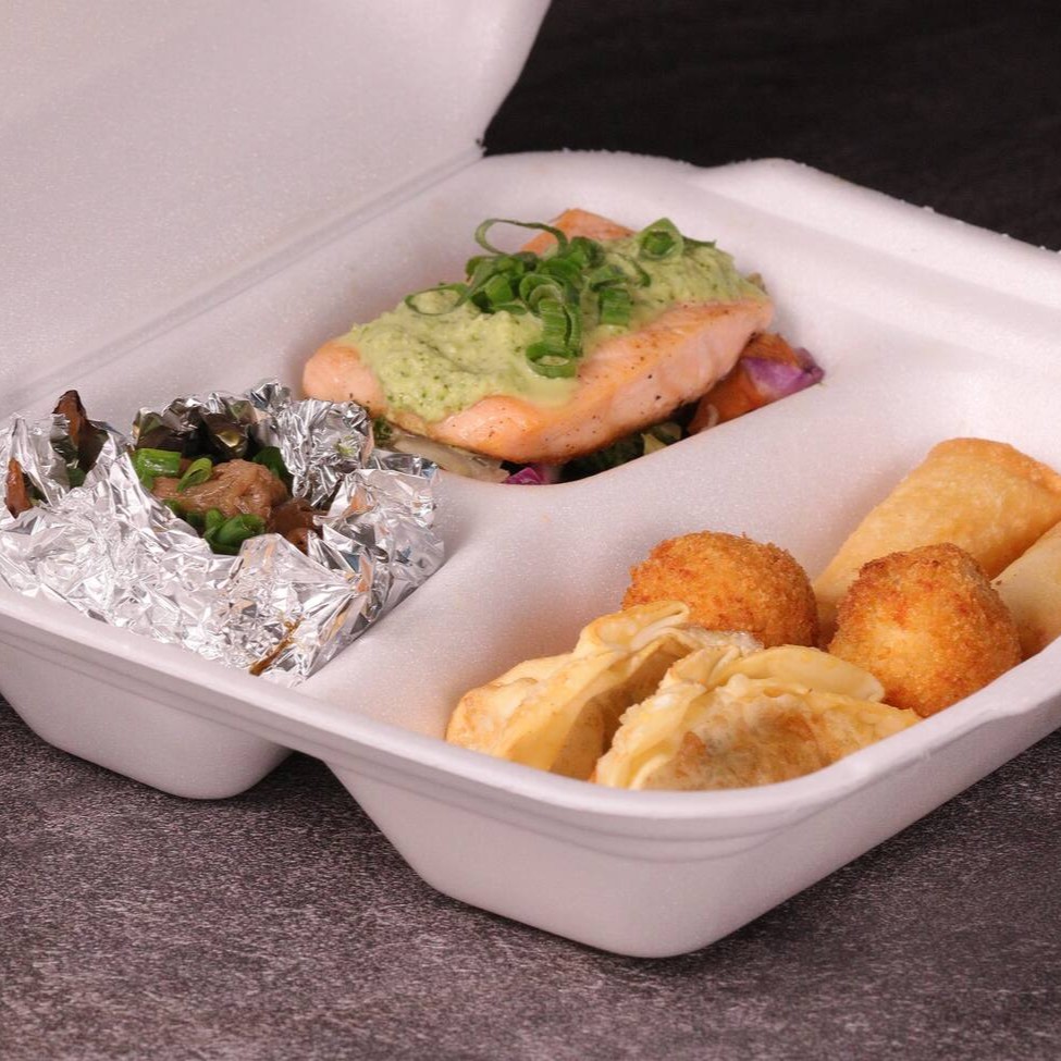 2 gyoza 2 harumaki de queijo 1 porção de shimeji 1 salmão grelhado com legumes (sem alteração)