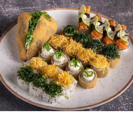 6 Jhou com maracujá 6 Hot holl Doritos 5 Niguiri do chef 5 Sashimi de salmão * todos maçaricados (sem alteração)