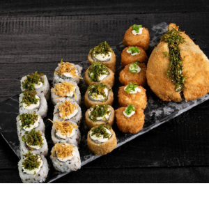 5 hot holl com couve crispy ,5joy empanado ,5 uramaki salmão grelhado ,5uramaki skin ,1 temaki de salmão empanado .