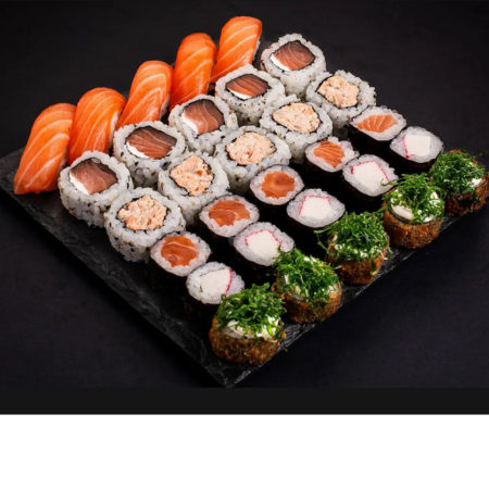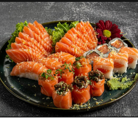 6 sashimi de salmão ,5 joy de salmão ,5 niguiri de salmão ,5 hossomaki de salmão ,5uramaki de salmão ,5 uramaki california ,5 hossomaki pepino .
