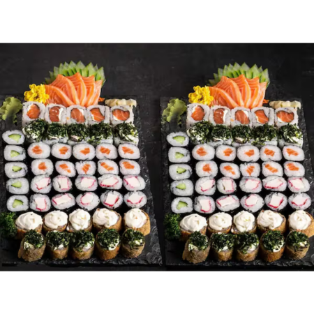 5 sashimi de salmão 5 niguiri de salmão 5 jhou de salmão 5 uramaki de salmão com cream cheese 5 urmaki filadelfia 5 hossomakis salmão 5 hossomaki pepino 10 hot holls (sem alteração)