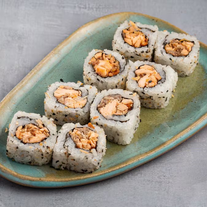 Apresentamos a voçê a seleção da categoria de 8 unidades, Trata-se de um primoroso uramaki, cujo exterior é ricamente coberto por um mix de arroz e gergelim, conferindo uma textura crocante e saborosa. Dentro, encontramos um generoso recheio de salmão fresco, cuja qualidade é inegável, acompanhado por um suave e cremoso cream cheese. A combinação desses ingredientes proporciona um paladar único, marcado pelo equilíbrio entre a suavidade do salmão e o toque aveludado do cream cheese...