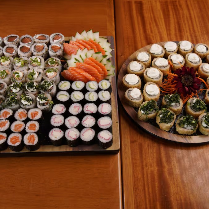 Este prato é uma deliciosa combinação de 12 unidades de sashimi, meticulosamente preparado para encantar seu paladar. Ele inclui 6 saborosos sashimis de salmão, com seu sabor suave e textura sedosa, perfeitamente contrastados por 6 sashimis de tilápia, conhecidos por sua leveza e sabor delicado. Cada fatia é cuidadosamente cortada para realçar o sabor fresco e autêntico do peixe. Este prato é uma verdadeira celebração dos sabores do mar, perfeito para os amantes de sushi que apreciam a simplicidade e a elegância do sashimi.