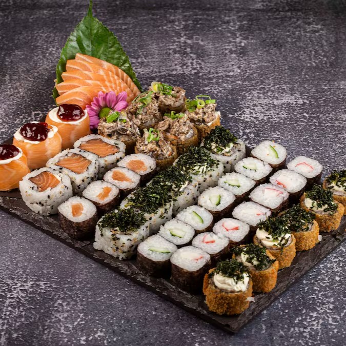 Apresentamos nosso deslumbrante 'Sushi e Sashimi Trufado', protagonista de nossa categoria .O prato é composto por 5 fatias de sashimi de salmão, cuidadosamente trufado, realçado por raspas de limão siciliano e delicadamente finalizado com uma pitada de flor de sal. O conjunto é complementado por 5 peças de nigiri de salmão, igualmente trufado e adornado com raspas de limão siciliano e flor de sal. Uma verdadeira delícia que aguça o paladar e encanta os sentidos!